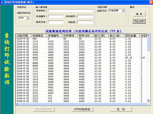 7、数据管理功能。可按试验日期,申请单位,申请编号,材料牌号,取样方向,试验者等为关键字,查询检测试样的试验结果(测试数据),并可打印输出试验结果;可对操作者信息进行查询、编辑等。