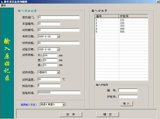 4、数据输入功能。输入试验日期,申请单位,申请编号,材料牌号,取样方向,缺口(宽),缺口(高),试验者,试验温度等参数。