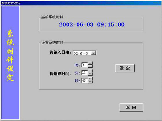 进入系统时钟设定界面后,该界面的上部显示系统时钟,输入所需的日期和时间后,按设定按钮设定新的系统时钟。