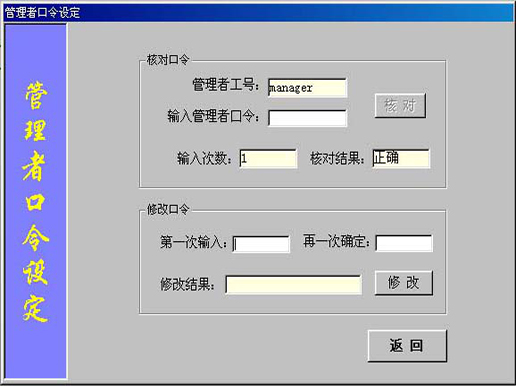 此时输入原管理者口令,然后点击核对按钮,如果密码正确,则又会在下面出现“修改口令”栏目。在该栏目中,输入新口令(两次),然后点击修改按钮,如果两次输入的口令不相同,则在修改结果提示项中显示错误提示,在此情况下必须重新输入新口令。如果修改成功,则在修改结果提示项中显示“成功”。点击返回按钮返回到主界面。