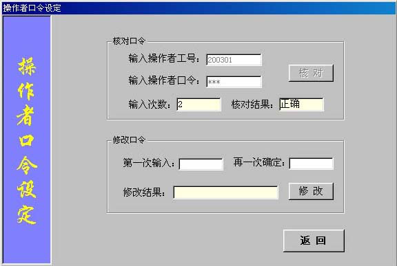 此时输入原操作者口令,然后点击核对按钮,如果密码正确,则又会在下面出现“修改口令”栏目。在该栏目中,输入新口令(两次),然后点击修改按钮,如果两次输入的口令不相同,则在修改结果提示项中显示错误提示,在此情况下必须重新输入新口令。如果修改成功,则在修改结果提示项中显示“成功”。点击返回按钮返回到主界面。