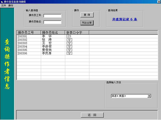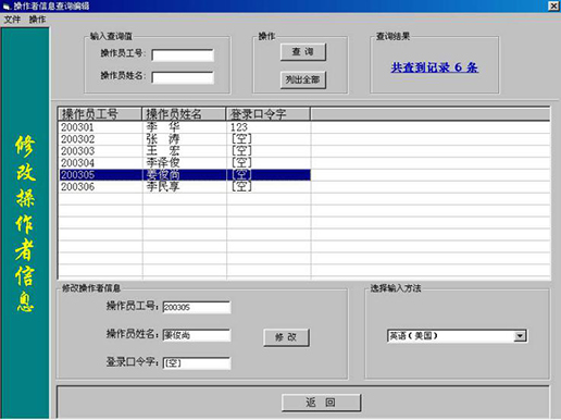 此时,系统首先把所有操作者信息列在屏幕上端,如果想增加新的操作者,则可在输入操作者信息栏目中输入操作者工号、操作者姓名、登录口令字等,然后点击输入按钮,即可完成数据输入。输入的操作者工号必须是唯一的,如果输入的操作者工号已经存在,则会给出相应的错误提示。