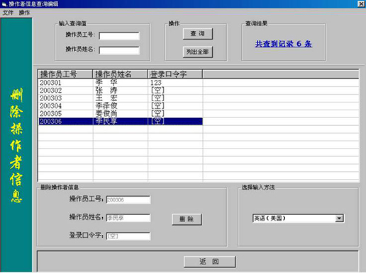 此时,系统首先把所有操作者信息列在屏幕上端,如果想删除某一个操作者信息,在操作者信息显示栏中,用鼠标选择相应的记录,则在屏幕下端会出现“删除操作者信息”栏目。然后点击删除按钮,屏幕又会出现一个提示框,提示“确实要删除这条记录吗?”,此时如果点击是按钮,则将这条操作者信息记录删除。如果点击否按钮,则放弃删除。